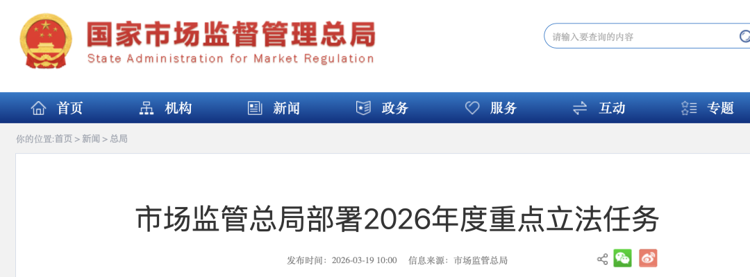 今日(3月19日),国家市场监管总局发布《部署2026年度重点立法任务》。其中,医疗器械管理法被纳入2026年度重点立法项目。